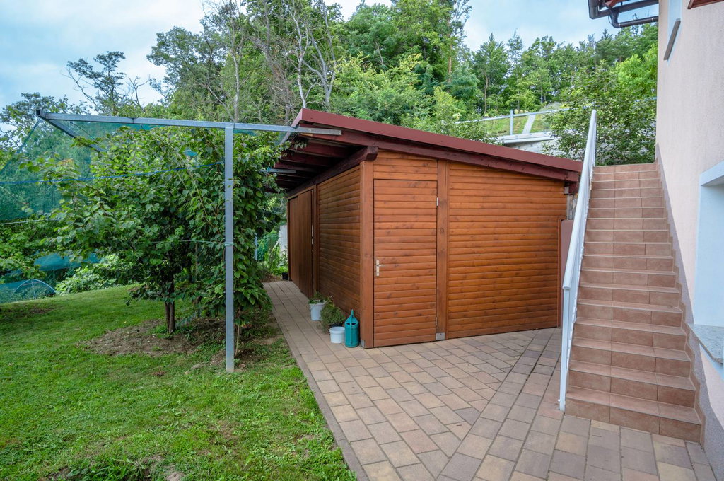 Zemljišče meri skupno 2.210 m2, pretežno ravno dvorišče, z urejenim tlakovanim dovozom do garaže, ob hiši ter poti do pomožnih objektov, v nadaljevanju dvorišča nivojsko urejene terase, kjer je zasajeno sadno drevje ter urejene visoke zelenjavne grede. Vse je zaščiteno proti toči, s kovinsko konstrukcijo ter mrežami. Zemljišče kljub svoji majhnosti omogoča skoraj povsem samostojno samooskrbo, saj je zelo dobro organizirano. Vso sadje ter zelenjava se prideluje brez škropiv. Na posesti se nahaja več vrst kakijev, češenj, trte, kivija, hrušk, sliv, jabolk, robidnic, skratka čez celo leto vam je na voljo sadje. Urejen tudi velik zalogovnik vode (12.000l) s črpalko, kar omogoča redno zalivanje. Ob dovozu zasaditev, ki omogoča zasebnost. Ob hiši stoji lopa, ki služi shranjevanju orodja ter vrtna hišica, lepo obraščena, zasenčena, ki nudi prijeten kotiček v poletnem času.