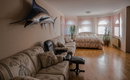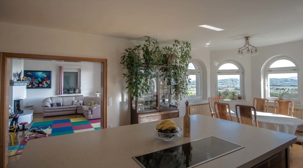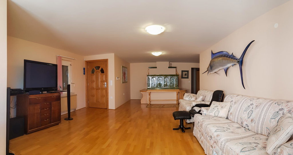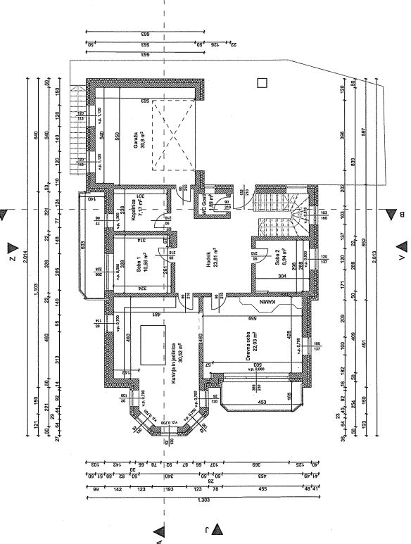 Pritličje obsega velik prostoren predprostor, kuhinjo z jedilnico, povezano z dnevno sobo s kaminom, ter z urejenim izhodom na balkon, od koder sega pogled na vse strani. V nadaljevanju dve sobi (ena z balkonom), kopalnica ter samostojni wc. Urejen tudi prehod v garažo za dva avtomobila, v izmeri neto 31 m2.