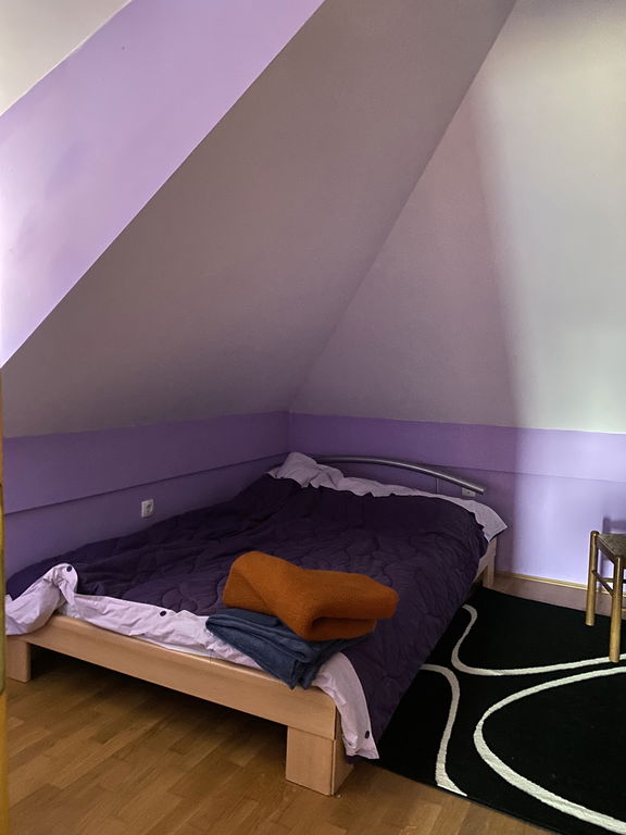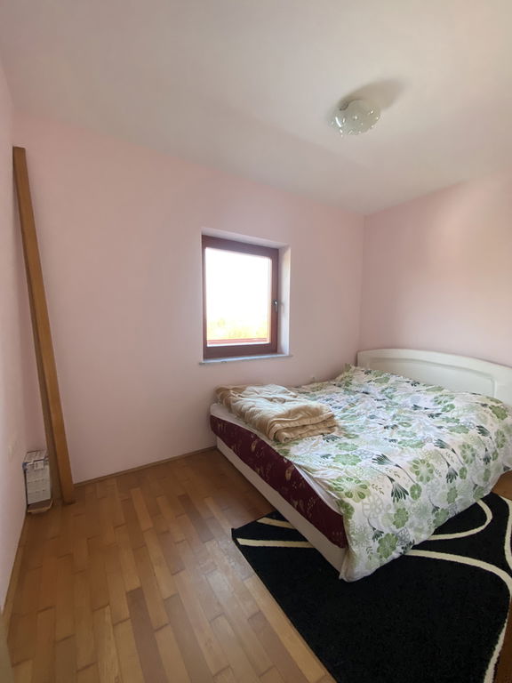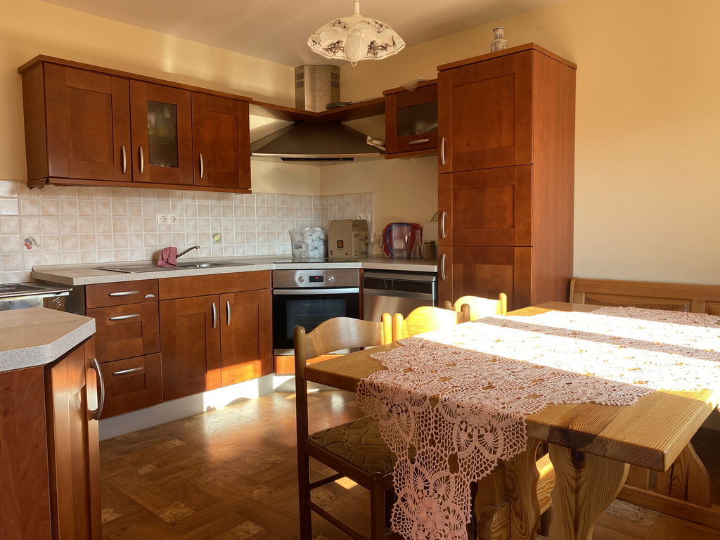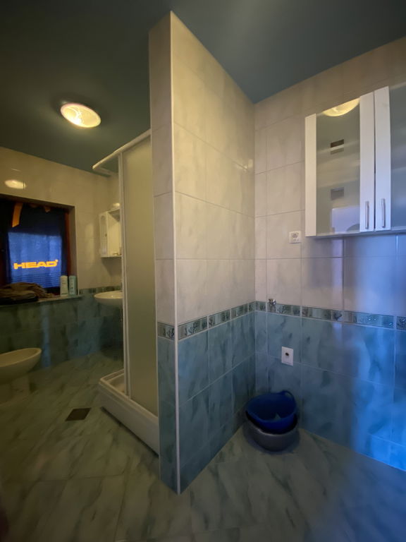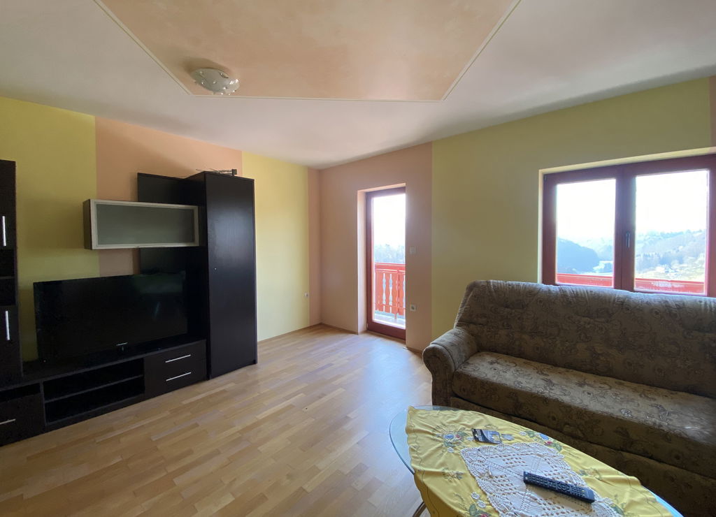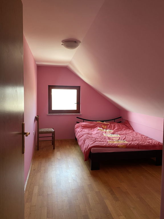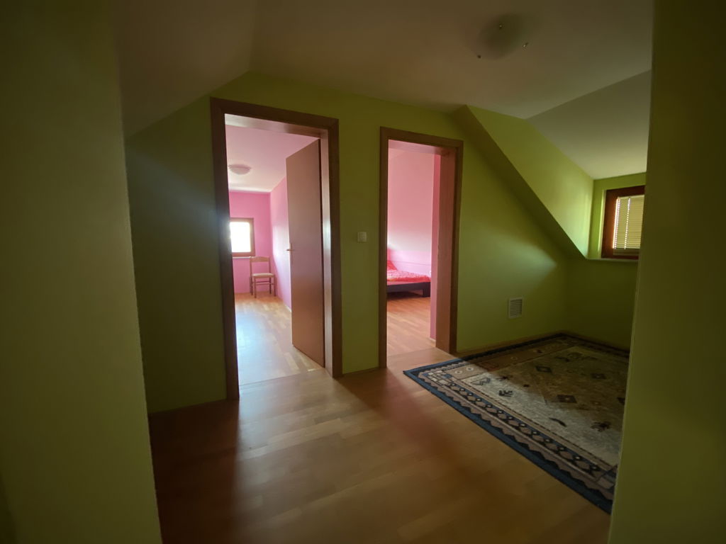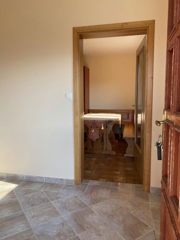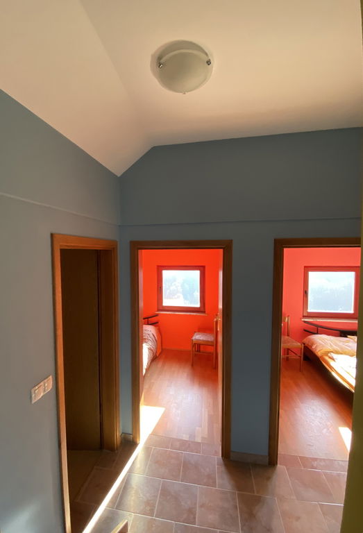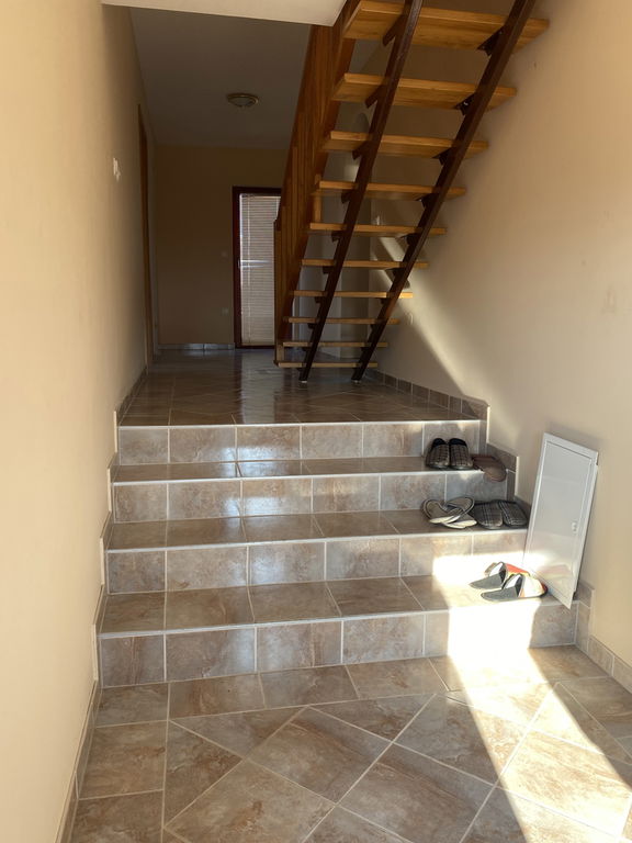 Stopnišče vodi do stanovanjskega dela, ki obsega v prvi etaži domačo kmečko kuhinjo s pečjo na drva (kjer običajno tudi kuhajo) ter jedilnico. V nadaljevanju je prostorna dnevna soba s toplozračnim kaminom z izhodom na balkon, v nadaljevanju spalnica, samostojni wc, kopalnica. Stopnišče nas vodi v drugo etažo, ki obsega dve sobi ter kopalnico s tušem. Etažo višje še izkoriščena mansarda kjer so tri sobe ter tehnični prostor.
