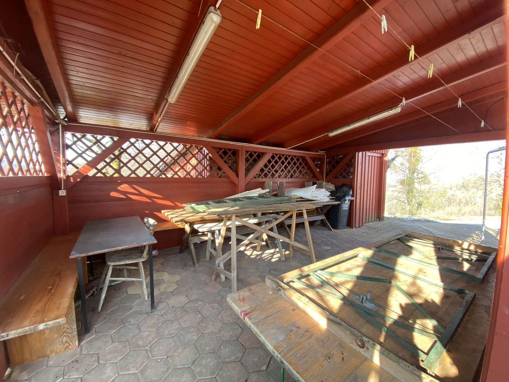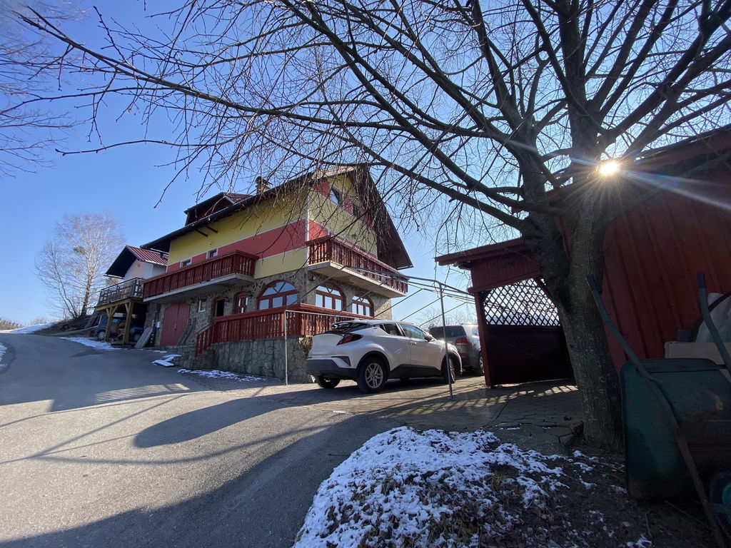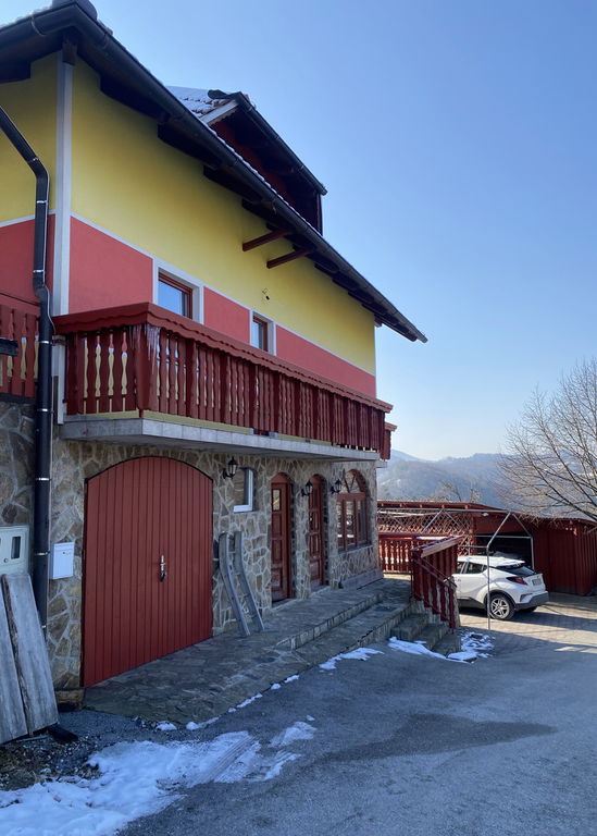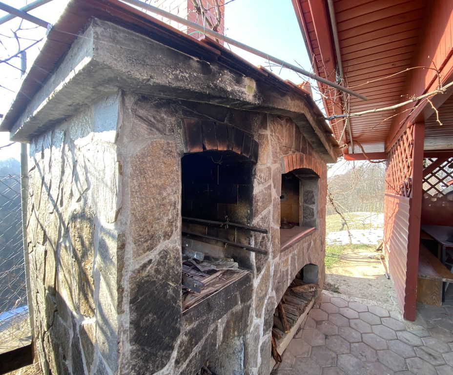 Ob hiši stoji nadstrešek, ki je prav tako namenjen za druženje, ob njem pa zidan kamin. Lokacija je odlična saj se ponaša s prečudovitim pogledom na sosednje griče, odmaknjena od vsakodnevnega vrveža, v objemu narave.