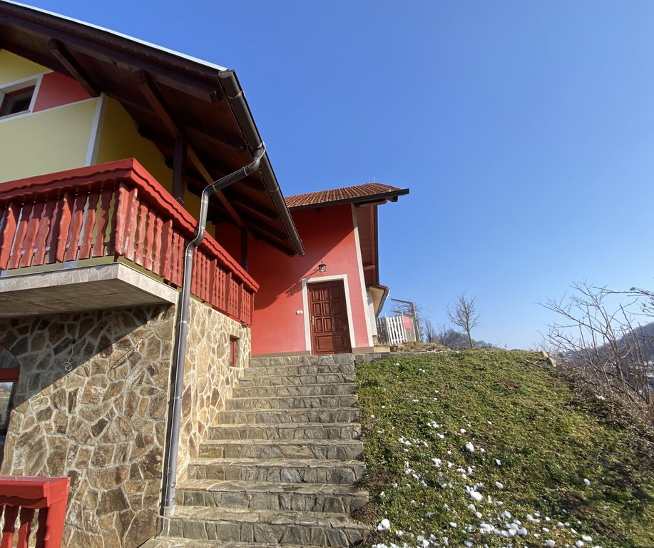 Ob hiši stoji nadstrešek, ki je prav tako namenjen za druženje, ob njem pa zidan kamin. Lokacija je odlična saj se ponaša s prečudovitim pogledom na sosednje griče, odmaknjena od vsakodnevnega vrveža, v objemu narave.