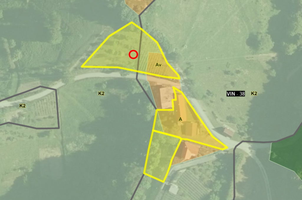 Domačijo obdaja zemljišče v skupni velikosti 2.542 m², od tega zemljišče z objekti in ohišnico meri 1.354 m². Nekaj deset metrov naprej se razprostira sadovnjak velikosti 1.188 m², ki poleg razgleda ponuja obilje sadnih dreves in nekaj trt. Manjši del sadovnjaka je zazidljiv, zato je primeren za gradnjo vinske kleti ali zidanice. Sadovnjak je obrnjen proti jugozahodu, kar pomeni veliko sonca skozi ves dan.
