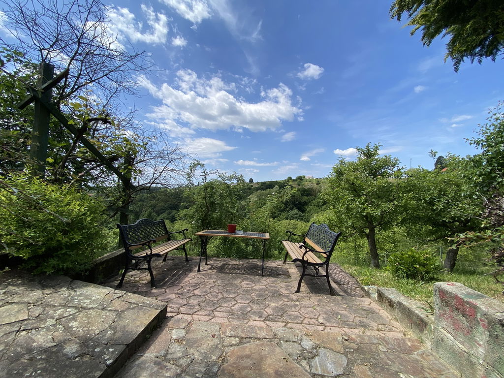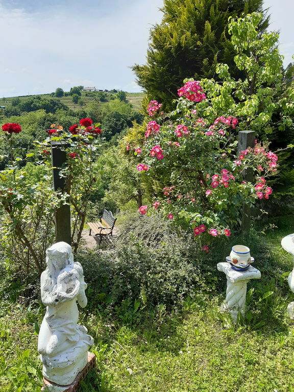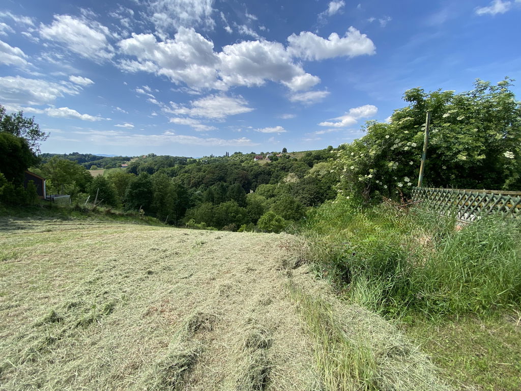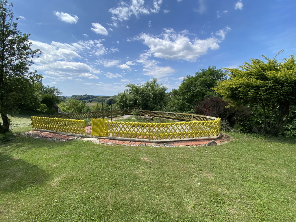 Zemljišče meri skupno 6.754 m2 in ob dovozni cesti ravno, potem se rahlo spušča po pobočju. Na posesti so številni kotički za sprostitev in nabiranje energije. Zasajeno sadno drevje od fig, jabolk, hrušk in sliv, urejen tudi vrt. Ob hiši stoji starejša cimprača, ki je zadnja leta služila kot gospodarsko poslopje. Naprej še puščen travnik, ki se pokosi dvakrat na leto.