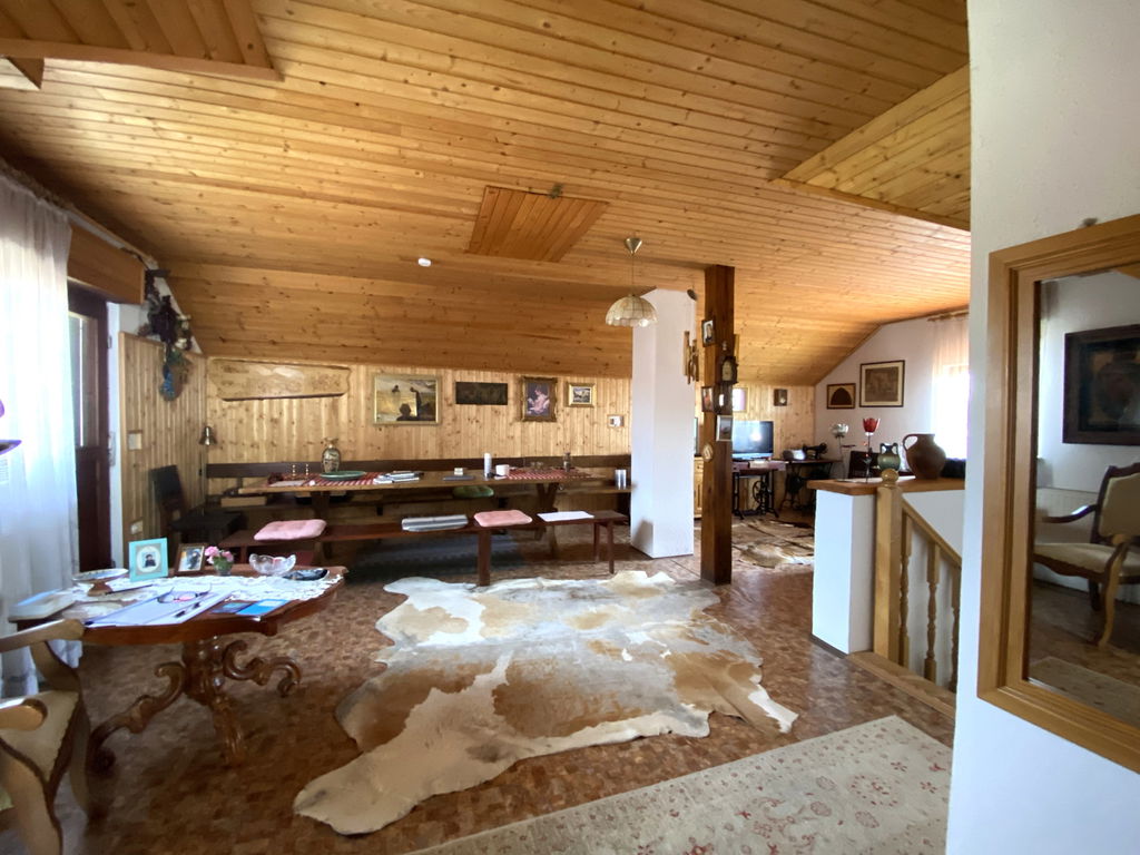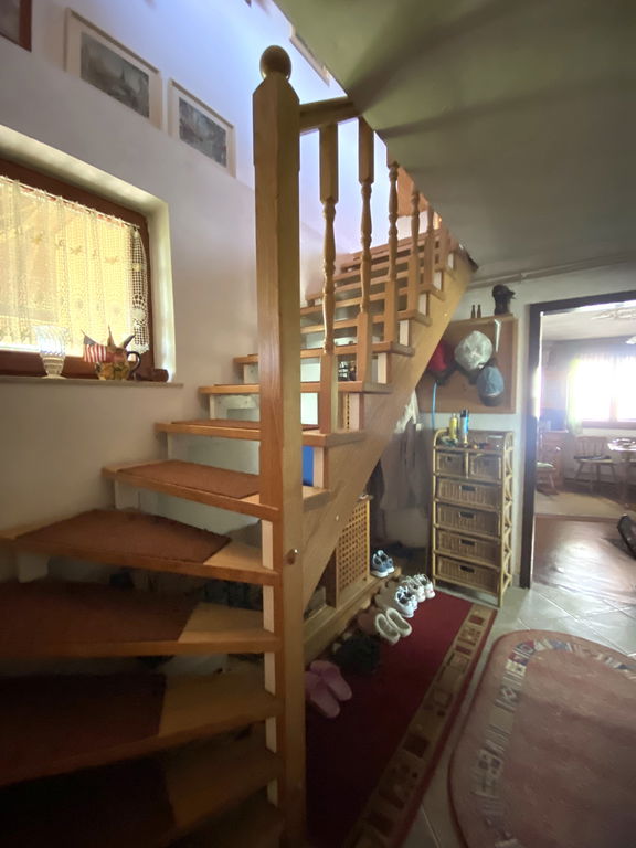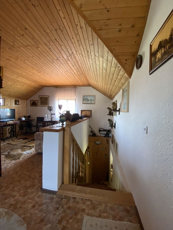 Hiša obsega predprostor - hodnik, wc, kopalnico, kuhinjo z jedilnico, dnevno sobo. Leseno stopnišče nas vodi v mansardo kjer je velik odprti večnamenski prostor, v nadaljevanju hodnik, ena manjša in ena zelo velika soba. Po tleh je položen leseni pod, itisoni, keramika. Od zunaj urejen vhod v garažo ter shrambo iz ene strani ter v klet iz druge strani, ki je namenjena za shranjevanje ozimnice, vina.