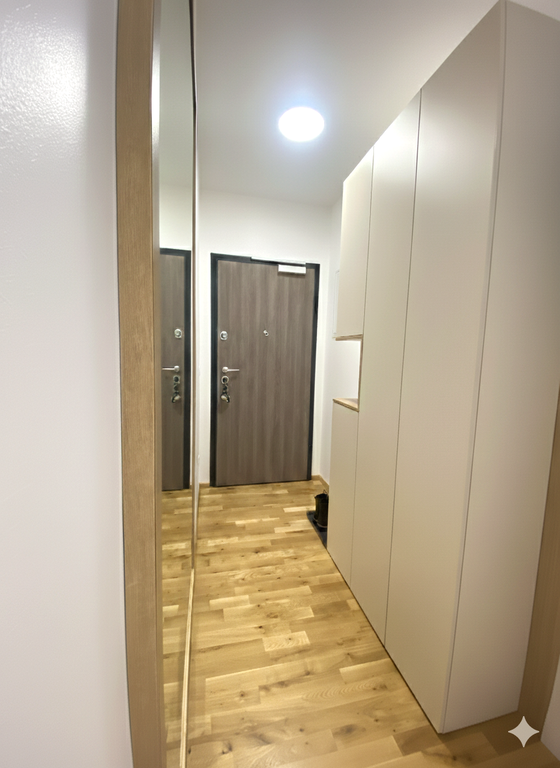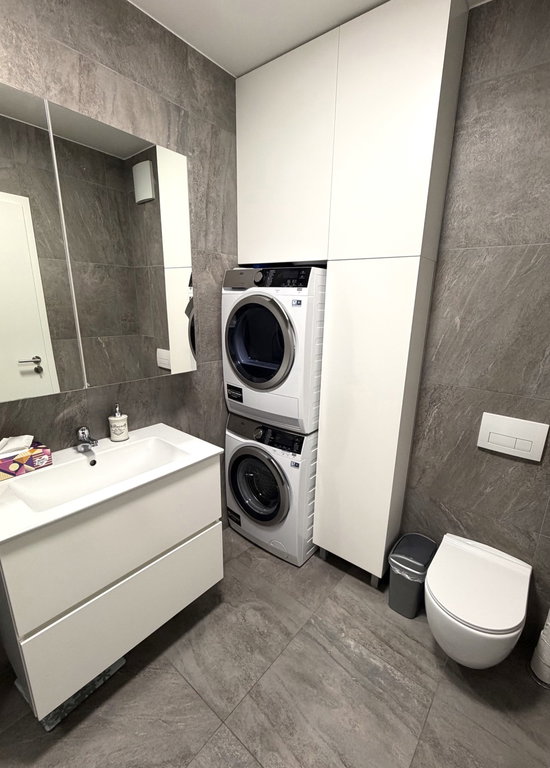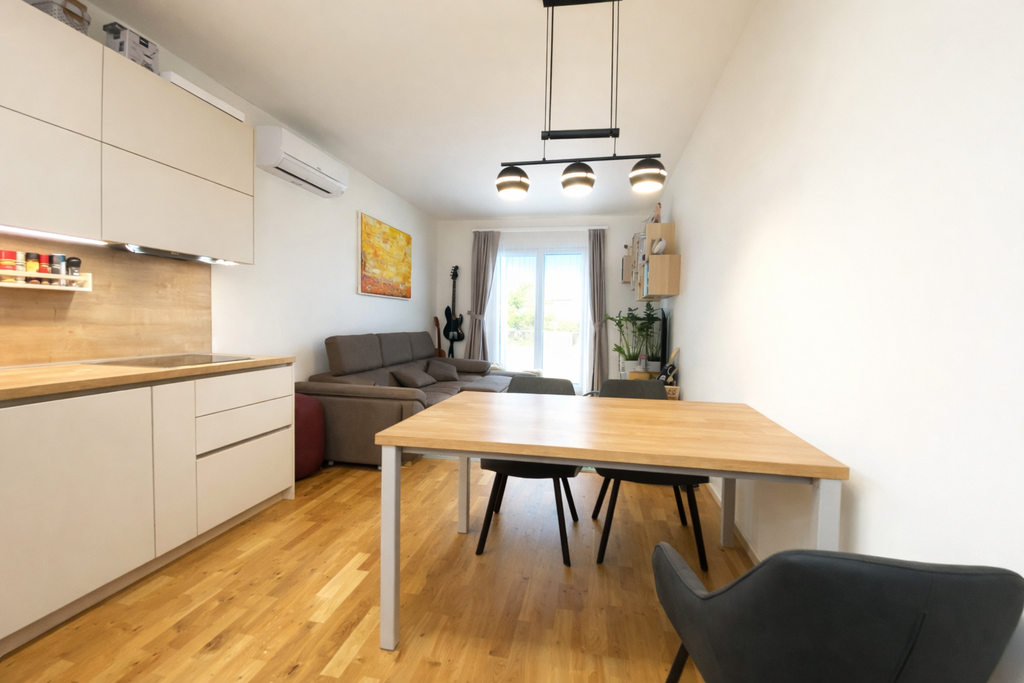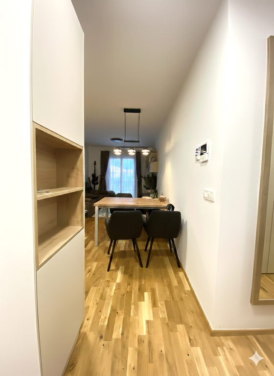 Stanovanje je izredno lepo razporejeno ter obsega predprostor z garderobnimi omarami, kuhinjo, jedilnico ter dnevno sobo v enem, z izhodom na prostorni balkon – ložo, ki daje stanovanju dodatni prostor za preživljanje prostega časa ter povezanosti z naravo. V nadaljevanju je hodniček, kopalnica s tušem ter spalnica z izhodom na drugi balkon – ložo, z zahodno lego, ki ponuja popolno zasebnost. Po tleh položeni parketi ter keramika. Kuhinja je opremljena s pečico, kuhalno indukcijsko ploščo, mikrovalovko, pomivalnim strojem, napo s filtrom ter kombiniranim hladilnikom, jedilno mizo ter štirimi stoli. V dnevni je kvalitetna in udobna sedežna ter minimalistični dnevni regal. V kopalnici je kopalniški blok, vgradna omara, v spalnici postelja ter omare, vso pohištvo je delano po naročilu.