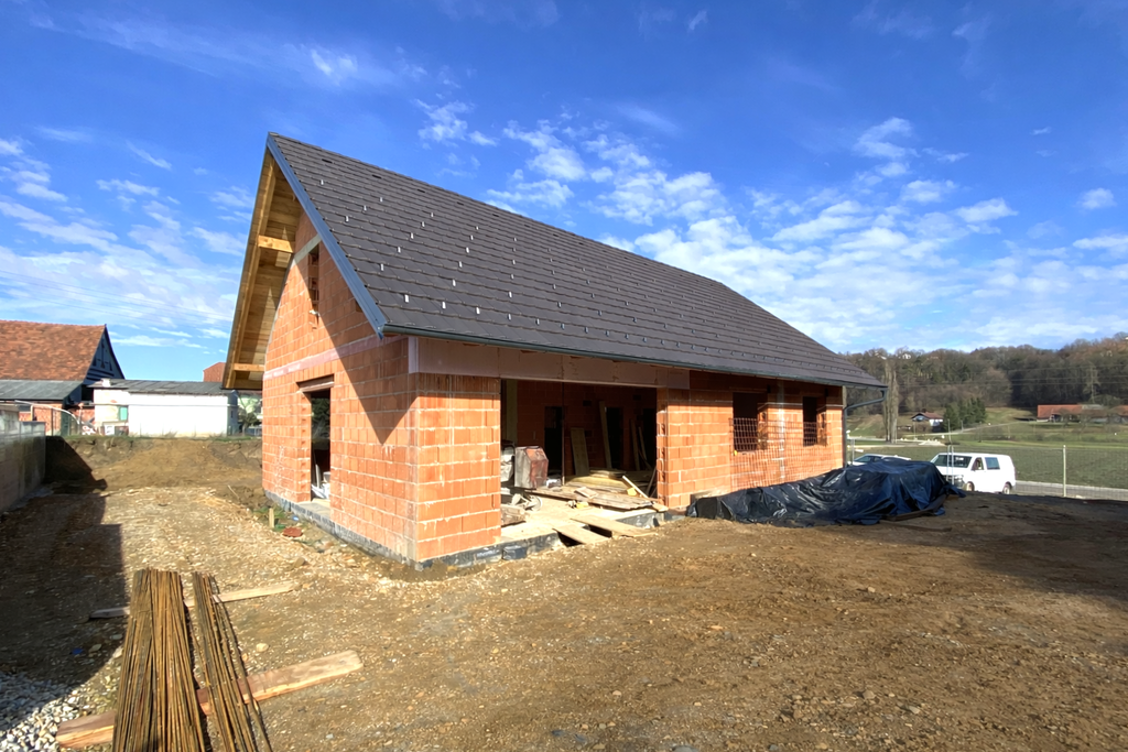 Hiša je klasične opečne gradnje s 30 cm opeko Porotherm, z lesenim ostrešjem, krita z opečno kritino. Temeljna plošča objekta je AB, debeline 30 cm. Plošča nad pritličjem je armiranobetonska. Fasada s toplotno izolacijo 15 cm ter zaključnim slojem. Vgrajeno stavbno pohištvo s tri slojno zasteklitvijo ter žaluzijami na el. pogon, vhodna vrata protivlomna. Urejene napeljave za elektriko, vodo, telefonijo ter čistilno napravo, predinštalacija za klimo. Ogrevanje je v celoti talno na toplotno črpalko. Vgrajen bo dimnik za postavitev kamina, ki ne pričara samo domačnosti ampak služi tudi izjemnim vremenskim razmeram.
